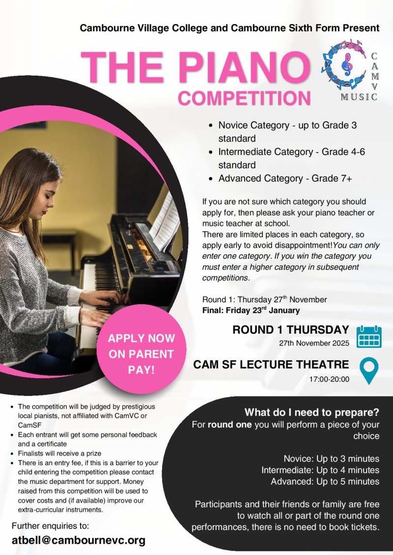On Thursday 27th November, CamVC Music is hosting round 1 of our new Piano Competition. More details in the advert below.